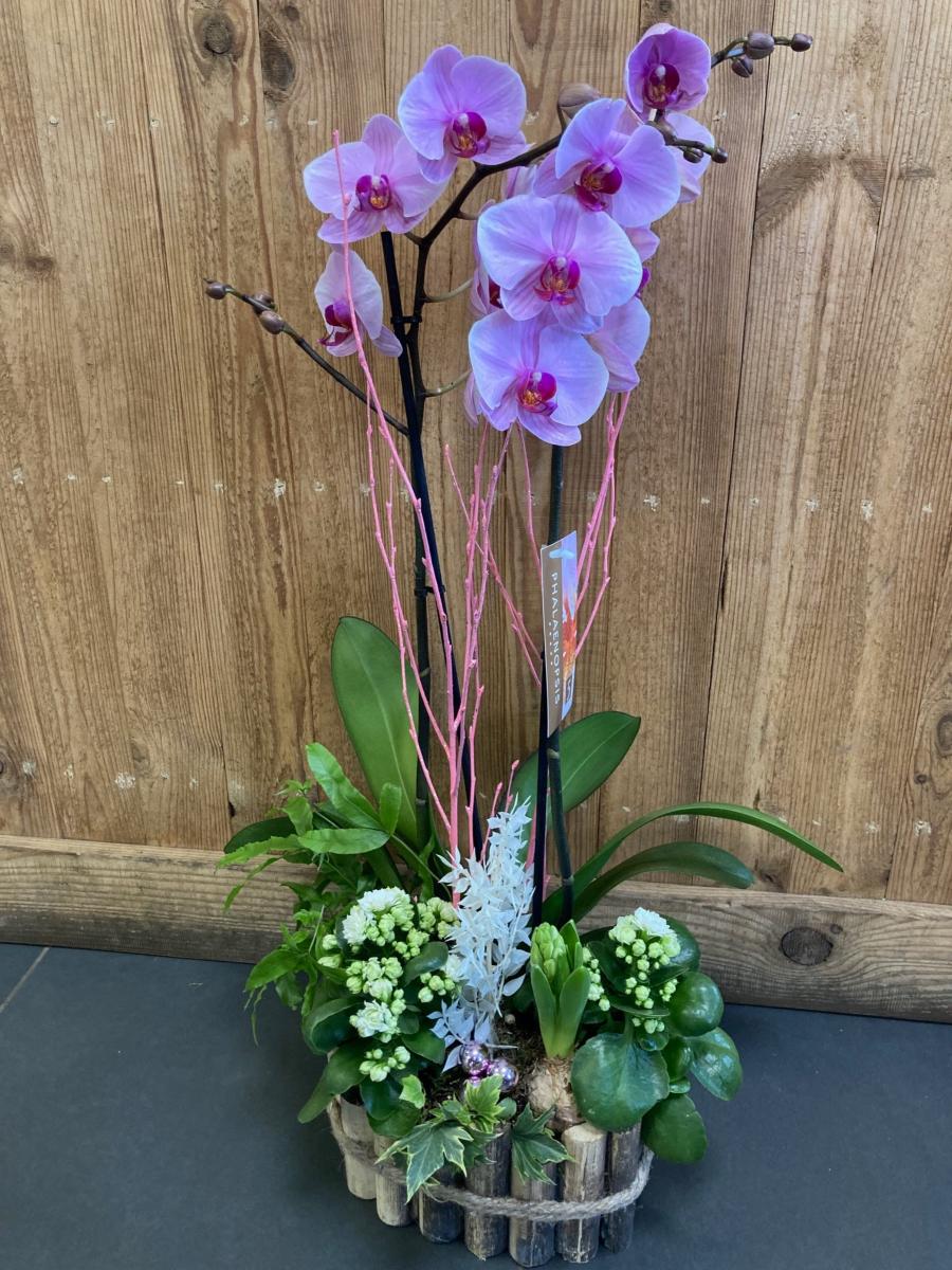 Une orchidée Phalenopsis associée à d'autres plantes dans une belle céramique tendance. Une céramique en harmonie de couleur met en valeur cette sublime orchidée. Orchidée deux tiges pour accentuer le côté florale. Le cache pot peut varier légèrement selon les arrivages.
